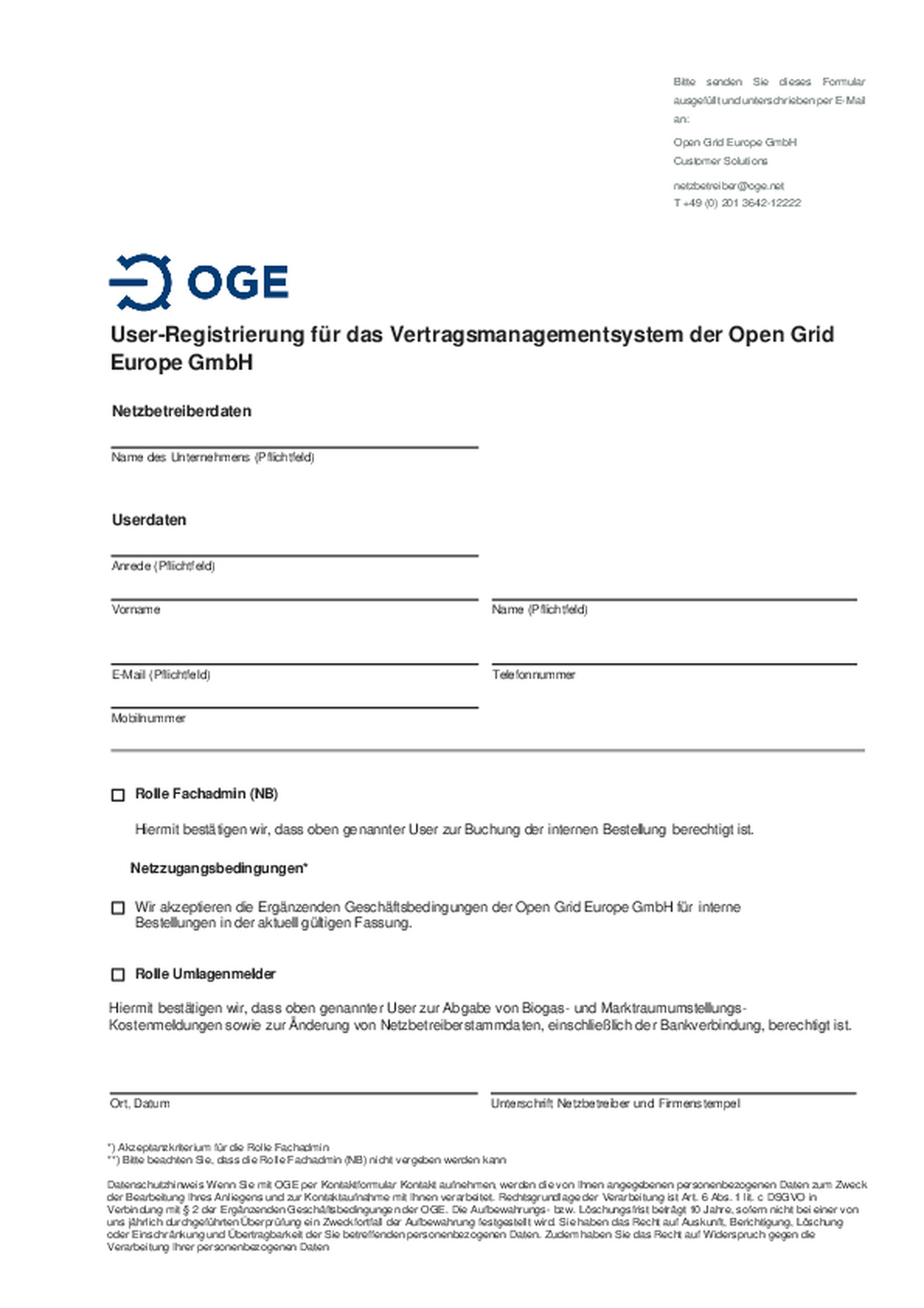 Das ausgefüllte Formular senden Sie bitte an: netzbetreiber@oge.net