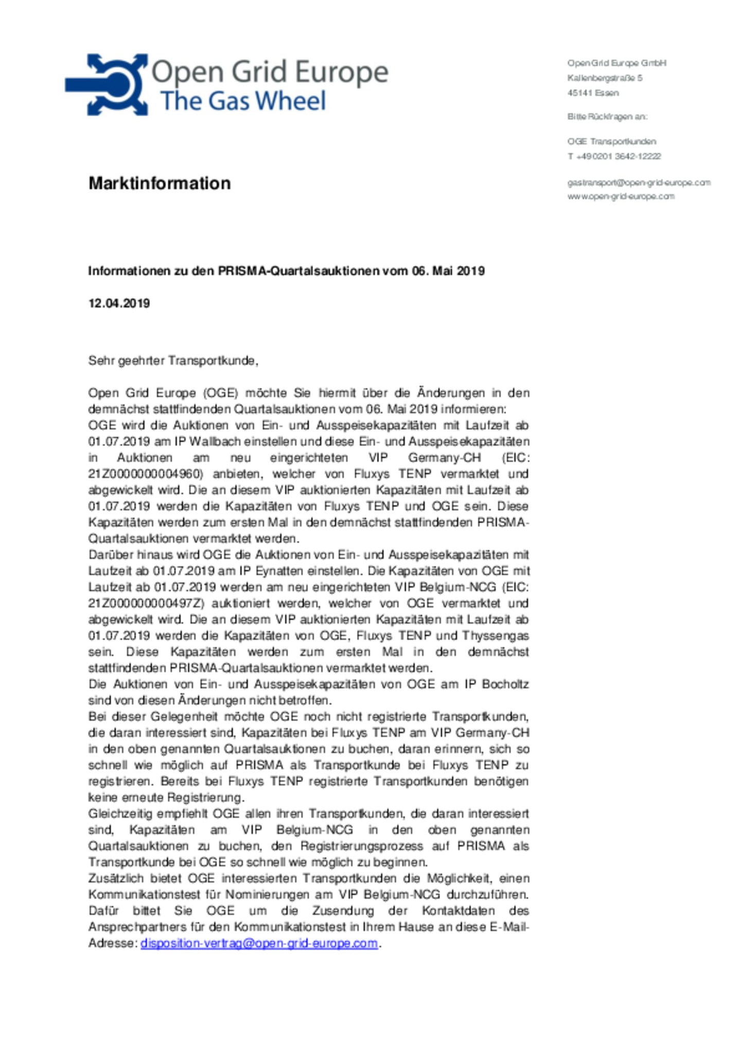 An den oben genannten IPs wird die Kapazitätsvermarktung aufgrund der Einführung der VIPs zwischen den Niederlanden und NCG ab dem Gastag 01.04.2020 eingestellt. Die letzten Kapazitätsauktionen an diesen IPs werden die Day-Ahead-Auktion und die Within-Day-Auktionen am 30./31.03.2020 für den 31.03.2020 sein. Bestehende Verträge an den oben genannten IPs werden dort unverändert verbleiben. Für Transportzeiträume ab dem Gastag 01.04.2020, 6 Uhr, werden alle Kapazitätsverträge nur noch an den entsprechenden VIPs abgeschlossen.