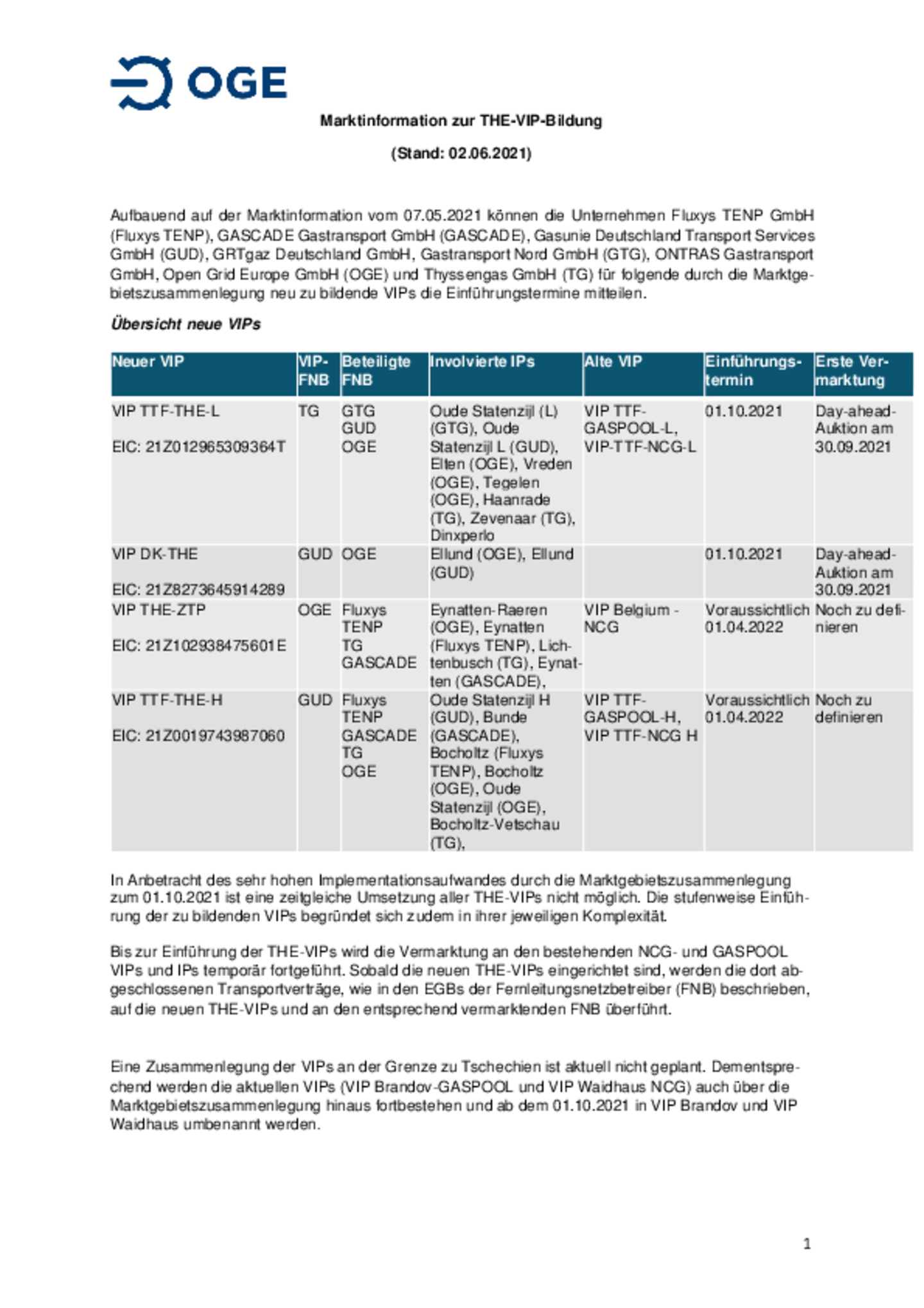 Die Unternehmen Fluxys TENP GmbH (Fluxys TENP), GASCADE Gastransport GmbH (GASCADE), GTG Nord GmbH (GTG), Open Grid Europe GmbH (OGE), Thyssengas GmbH (TG), ONTRAS Gastransport GmbH, Gasunie Deutschland Transport Services GmbH (GUD) und GRTgaz Deutschland GmbH möchten hiermit über den aktuellen Stand (02.06.2021) der VIP-Implementierung informieren.