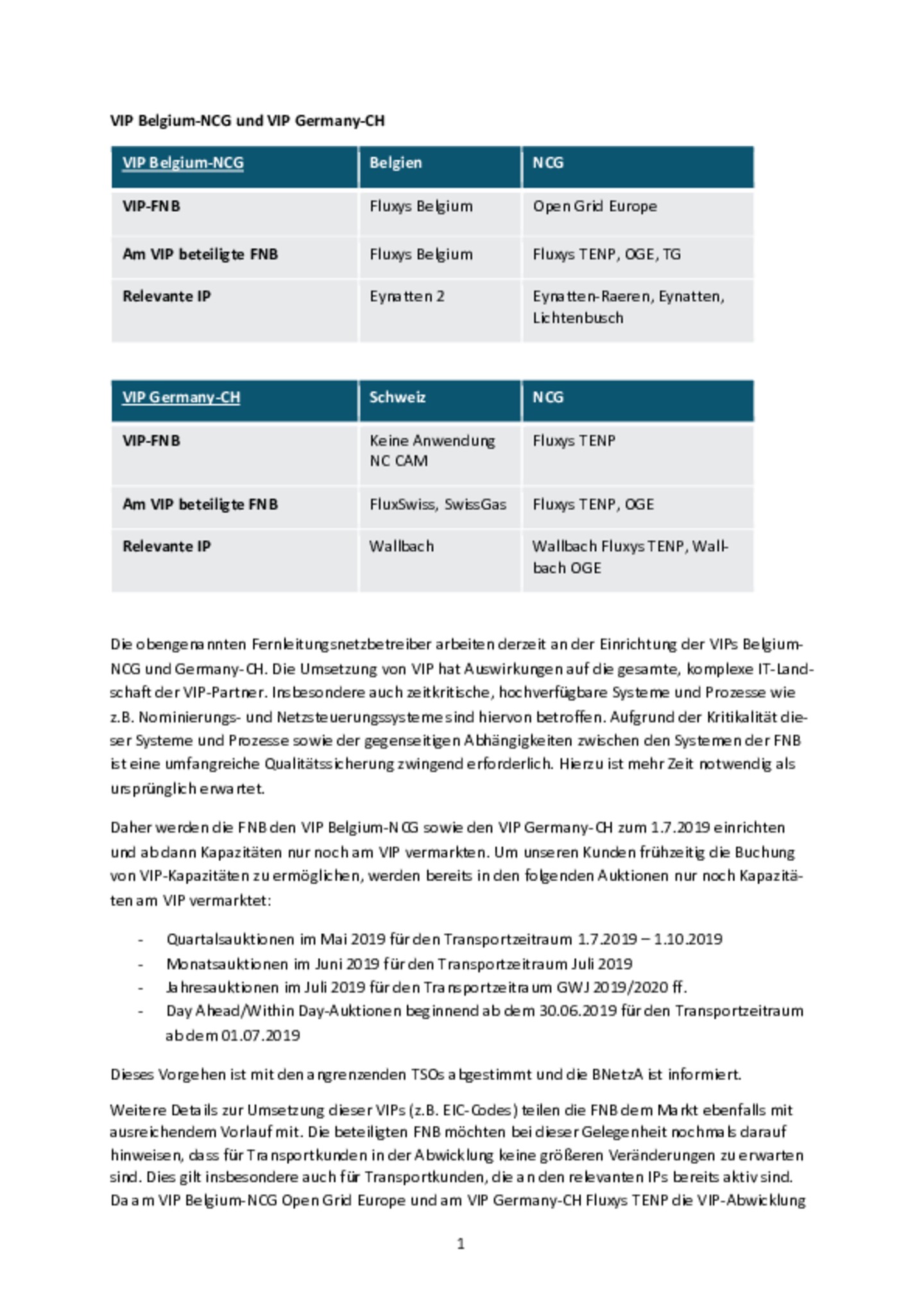 Die FNB konnten den VIP France-Germany sowie den VIP Waidhaus NCG zum 1.3.2019 erfolgreich einrichten. Dieser Umsetzungstermin ist mit den angrenzenden FNB abgestimmt und der BNetzA mitgeteilt worden.