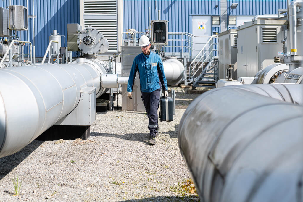 Gestern bin ich morgens um 7 Uhr hier an der Verdichterstation angekommen. Wir begannen mit einer Frühbesprechung zwischen dem Meister und mir als Vorhandwerker. Unsere Tagesplanung besprachen wir anschließend mit der Mannschaft, die aus sechs Kollegen besteht. Dann verteilten wir die Aufgaben: Wartung, Bauaufsicht, Arbeiten an den Leitungen. Ich selbst bin rausgefahren zu einer Baugrunderkundung. Mit Verantwortlichen einer externen Firma besprach ich die Arbeiten vor Ort, erstellte Arbeitsgenehmigungen und führte eine Sicherheitseinweisung durch. Der Arbeitstag hatte wieder diese abwechslungsreiche Mischung aus Bürozeit und Draußenzeit. Das gefällt mir immer besonders gut.