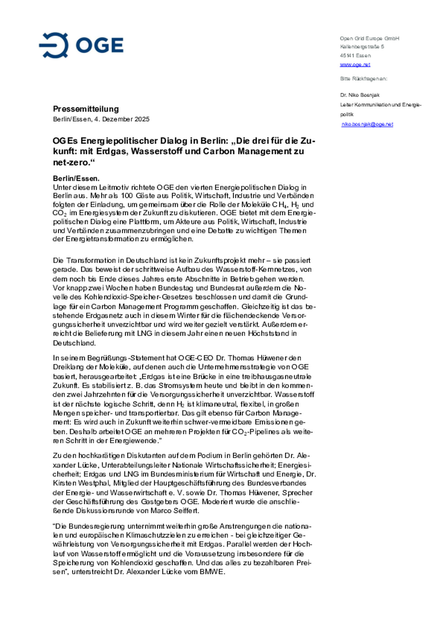 Open Grid Europe GmbH (OGE) sieht Erdgasnetz als wichtige Stütze für die Erreichung einer klimaschonenden und resilienten Energieversorgung an.