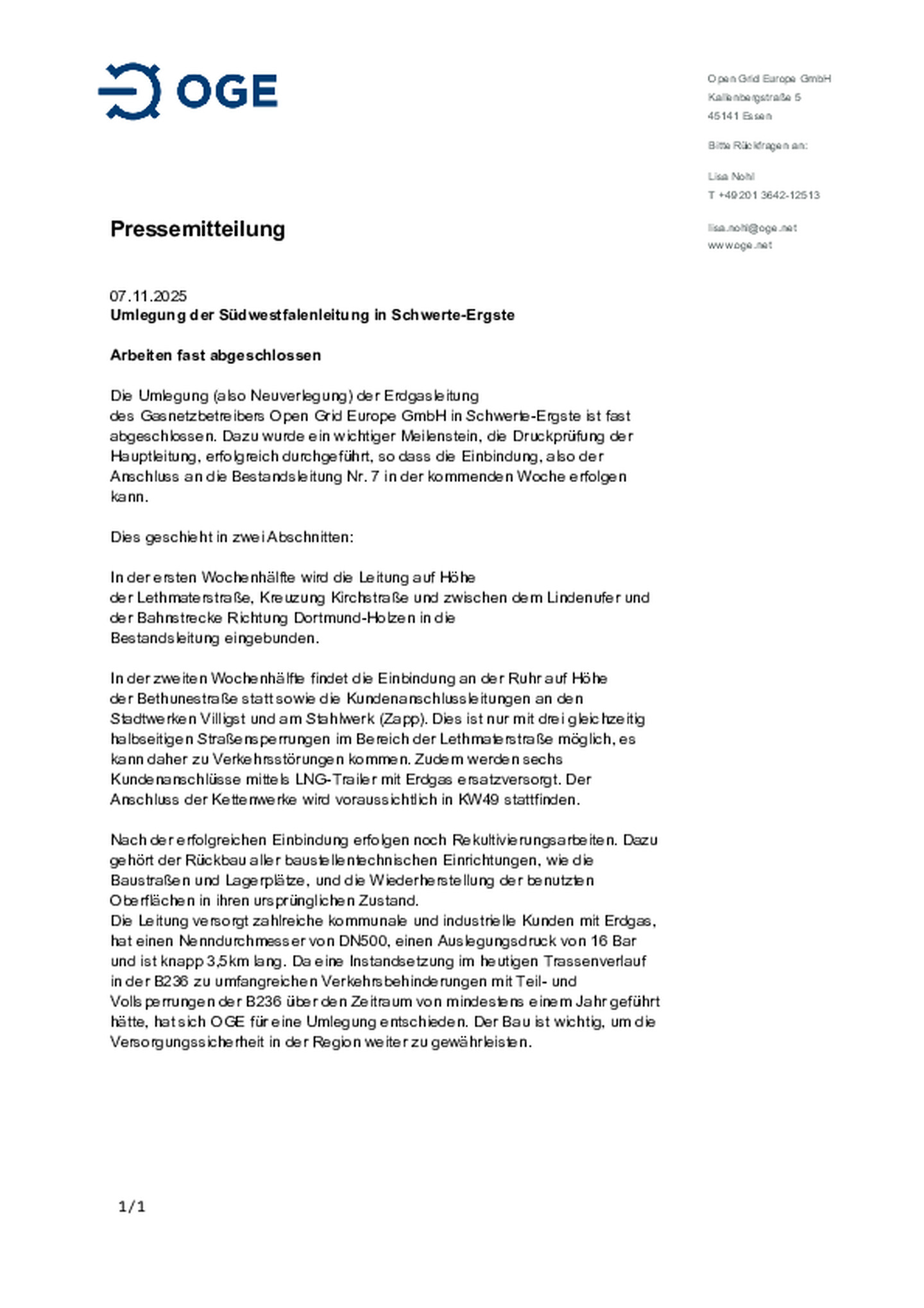 Gasnetzbetreiber Open Grid Europe GmbH (OGE) erreicht wichtigen Meilenstein im Rahmen des Baus der Leitung Etzel-Wardenburg (EWA). Verbindung der Baulose in Wiefelstede erfolgt. Ansprechpartner auch …nach Inbetriebnahme weiterhin vor Ort.