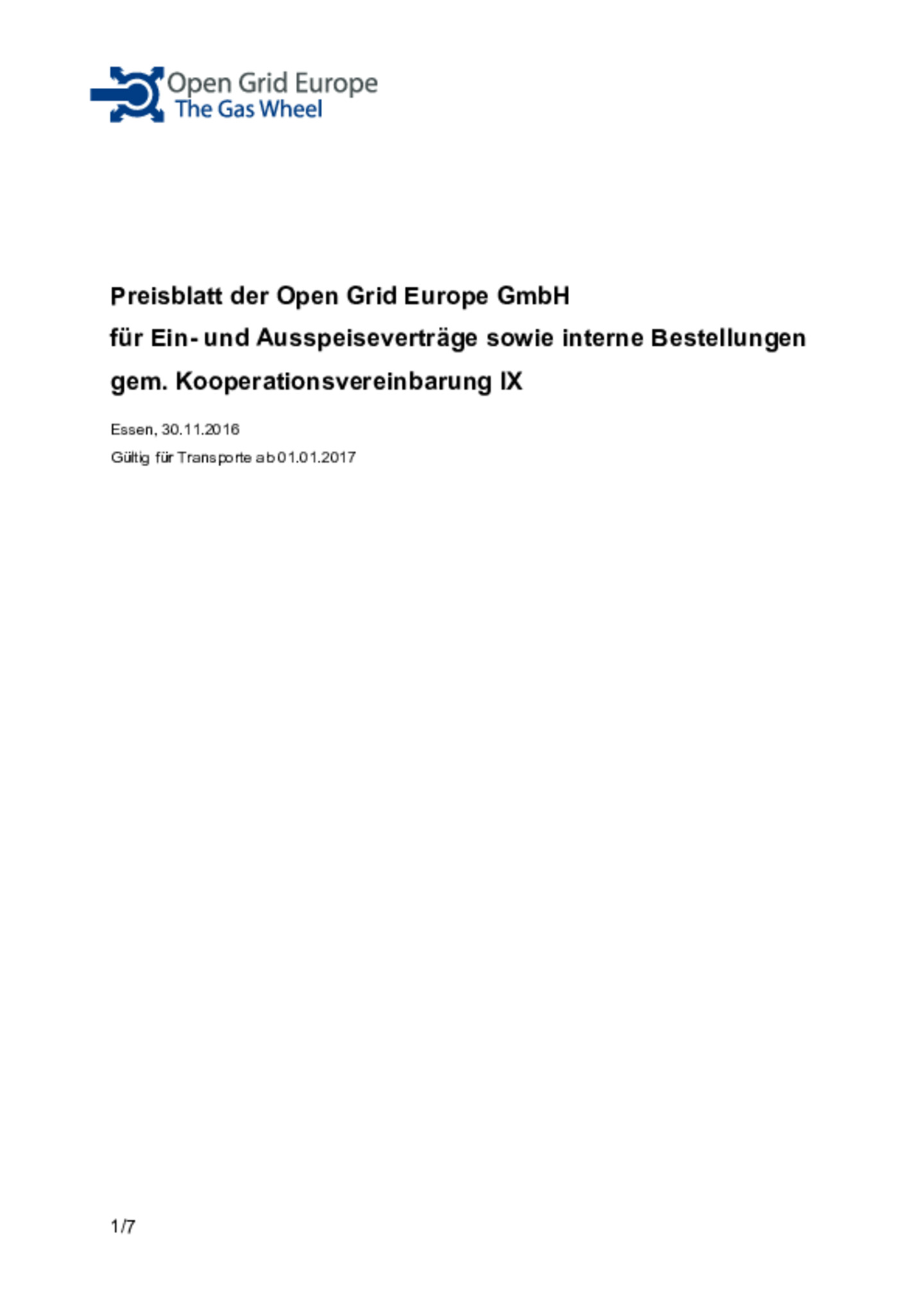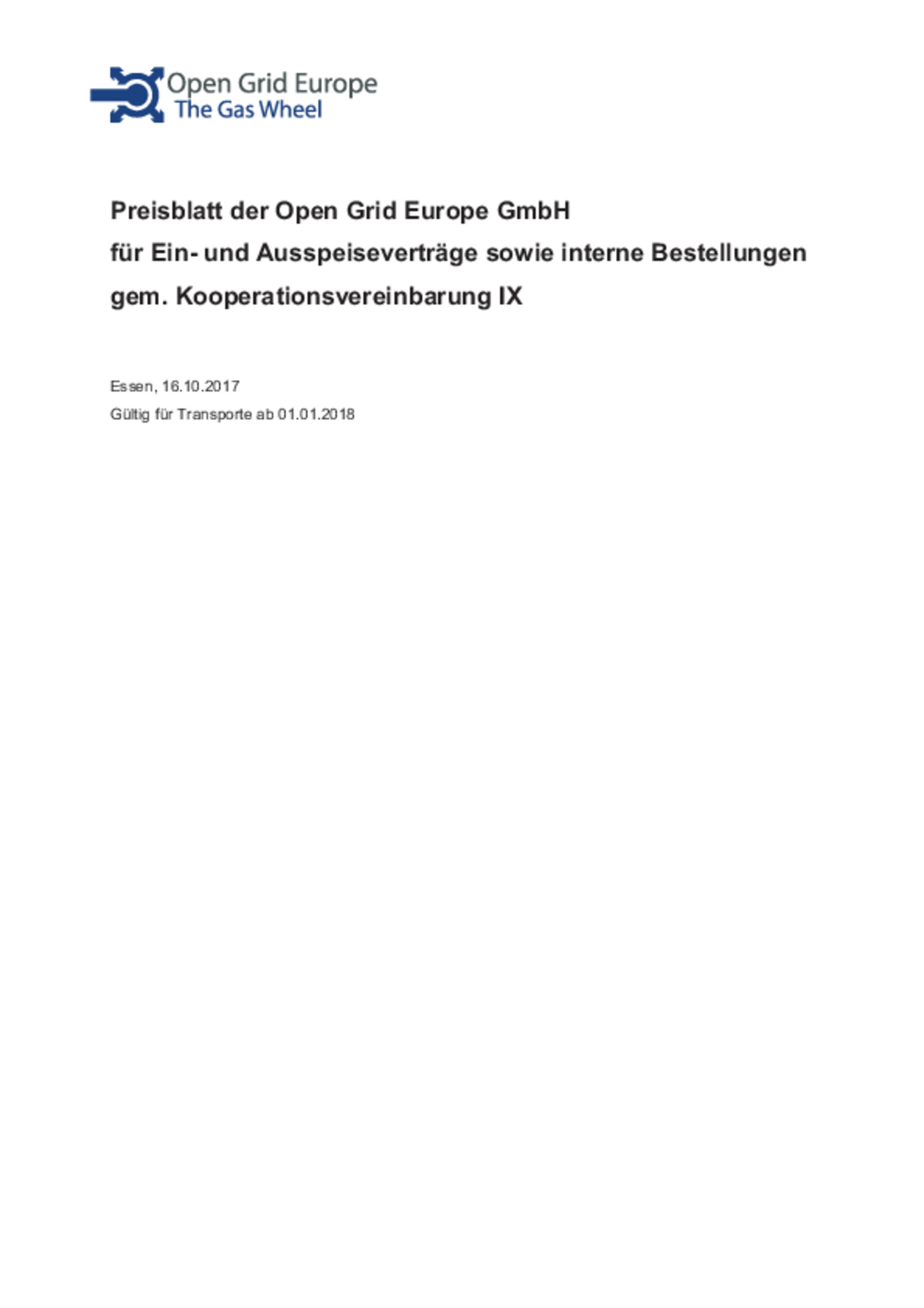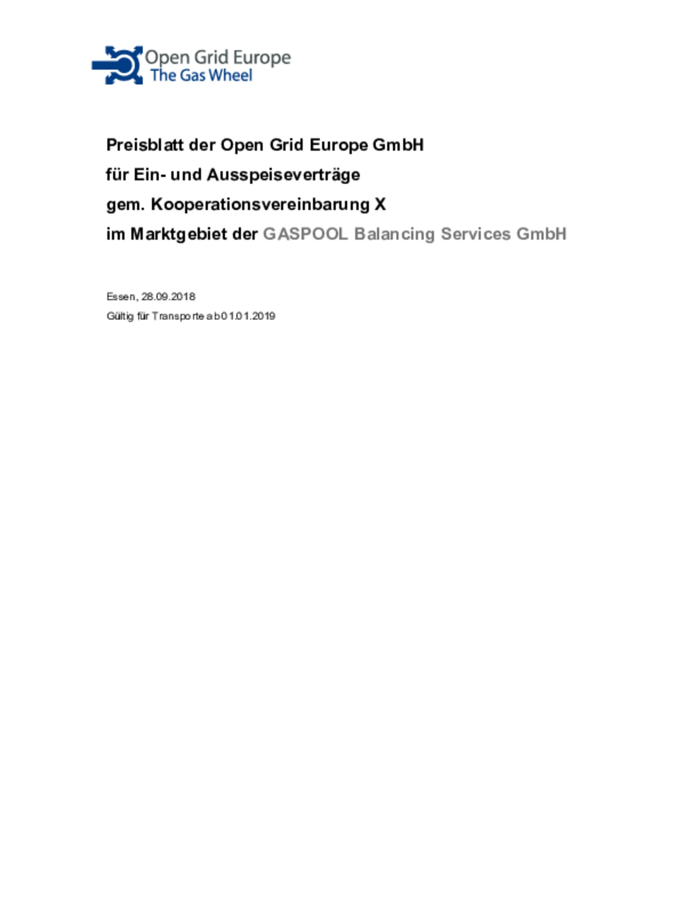 Ergänzung zum am 28.09.2018 veröffentlichten Preisblatt der Open Grid Europe GmbH für Ein- und Ausspeiseverträge sowie interne Bestellungen gem. Kooperationsvereinbarung X im Marktgebiet der NetConnect Germany GmbH & Co. KG (Preisblatt 2019)
