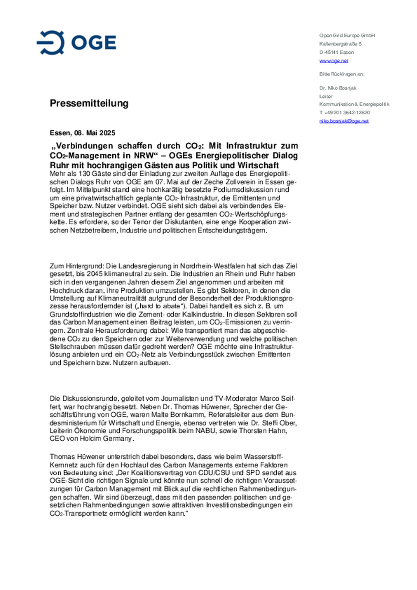 „Verbindungen schaffen durch CO₂: Mit Infrastruktur zum CO₂-Management in NRW“ – OGEs Energiepolitischer Dialog Ruhr 2025 mit hochrangigen Gästen aus Politik und Wirtschaft