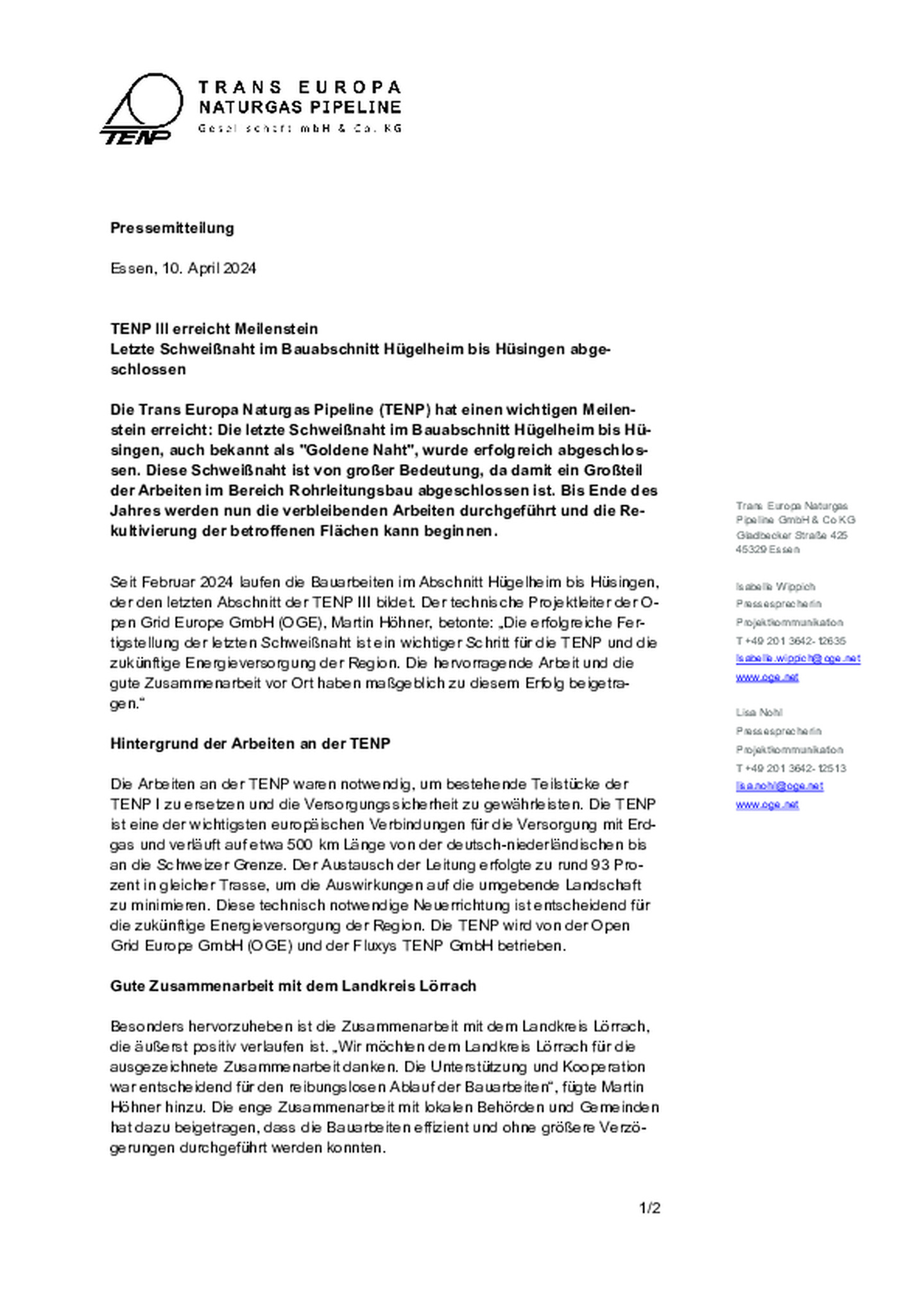 Der Gasnetzbetreiber Open Grid Europe GmbH (OGE) baut gemeinsam mit der Nowega GmbH eine neue Leitung, die zukünftig Wasserstoff transportieren wird: Die Leitung HEp verläuft zwischen Heek und Epe im Kreis Borken.