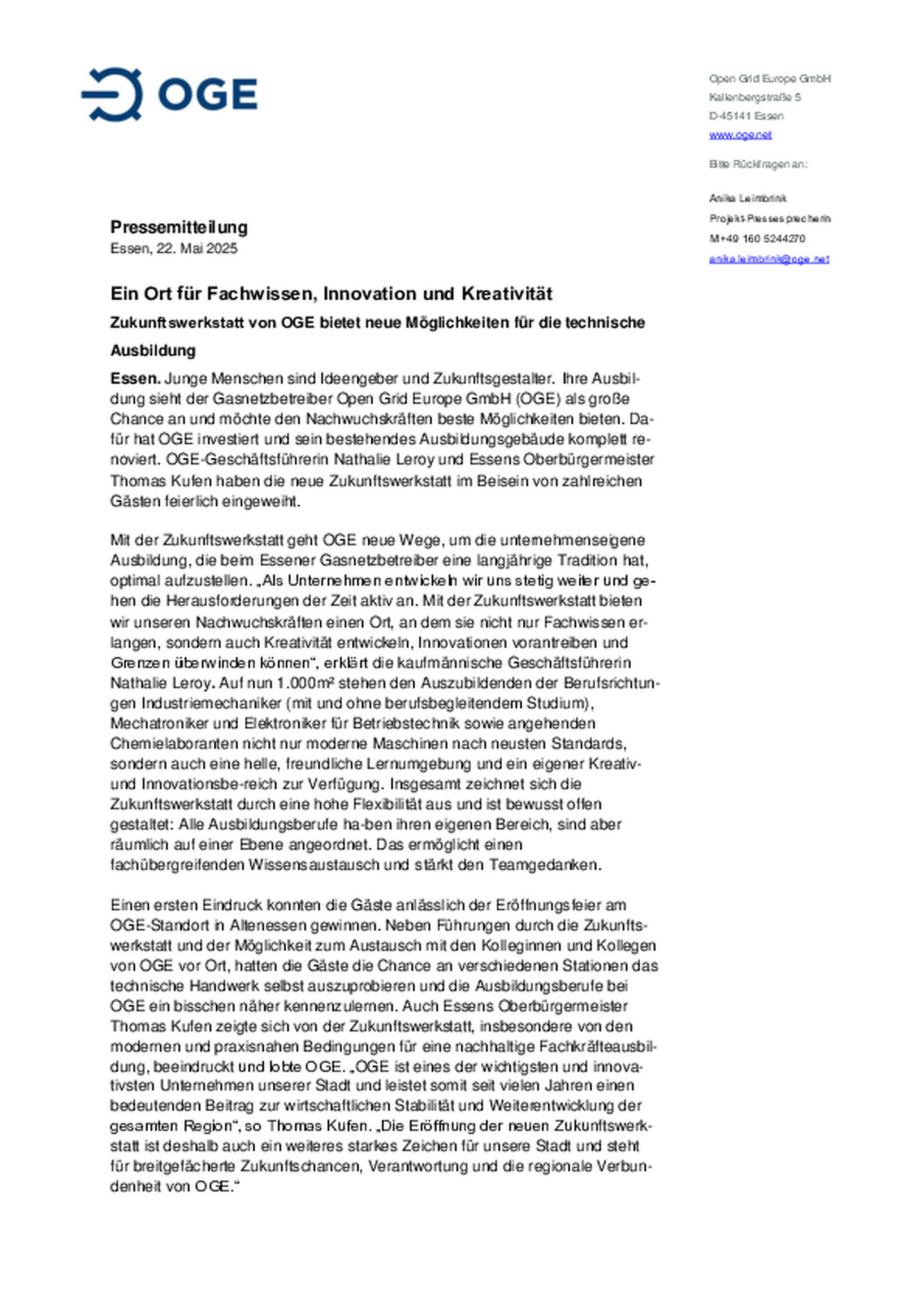 Zukunftswerkstatt von OGE bietet neue Möglichkeiten für die technische Ausbildung