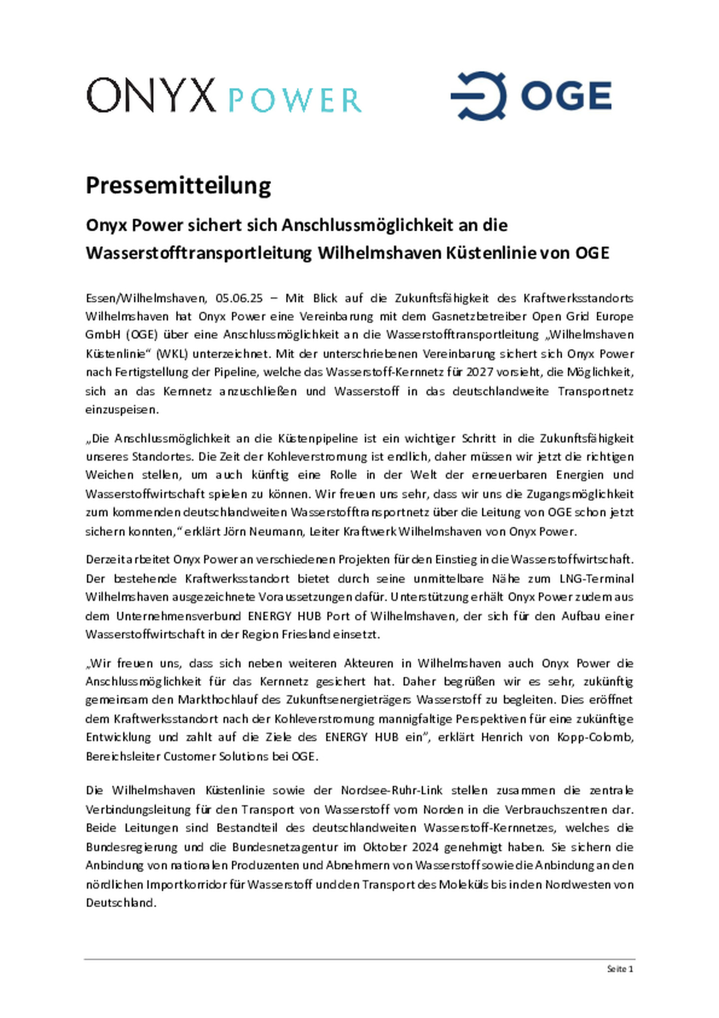 Mit Blick auf die Zukunftsfähigkeit des Kraftwerksstandorts Wilhelmshaven hat Onyx Power eine Vereinbarung mit dem Gasnetzbetreiber Open Grid Europe GmbH (OGE) über eine Anschlussmöglichkeit an die Wasserstofftransportleitung „Wilhelmshaven Küstenlinie“ (WKL) unterzeichnet.