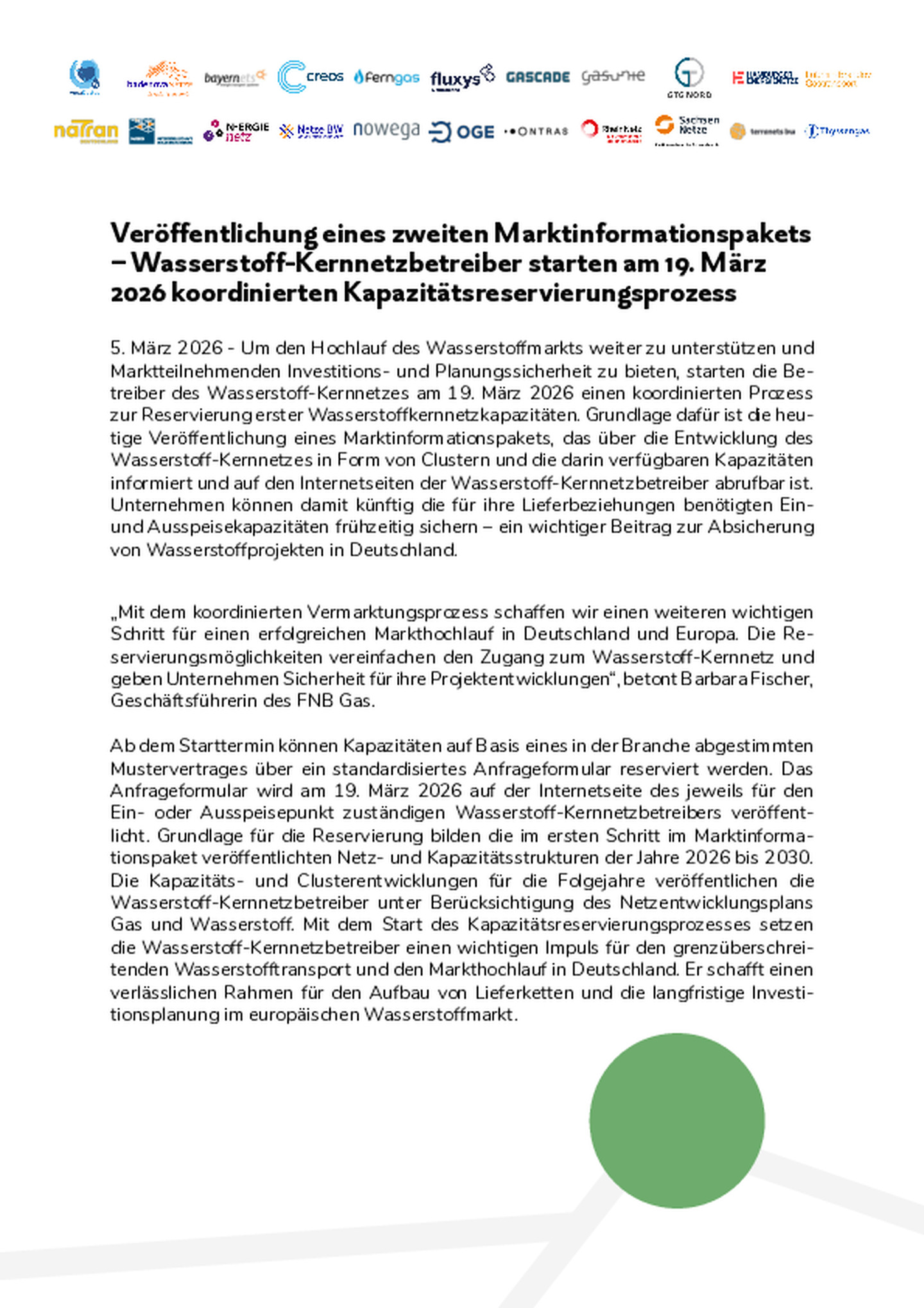 Ab dem Vermarktungsstart am 19. März 2026 kann Ihr Unternehmen erstmals Ein- und Ausspeisekapazitäten im Wasserstoff‑Kernnetz bis zu sieben Jahre im Voraus reservieren. Damit wird eine wesentliche Voraussetzung für Wasserstoff‑Projekte, Lieferbeziehungen und langfristige Investitionen geschaffen.