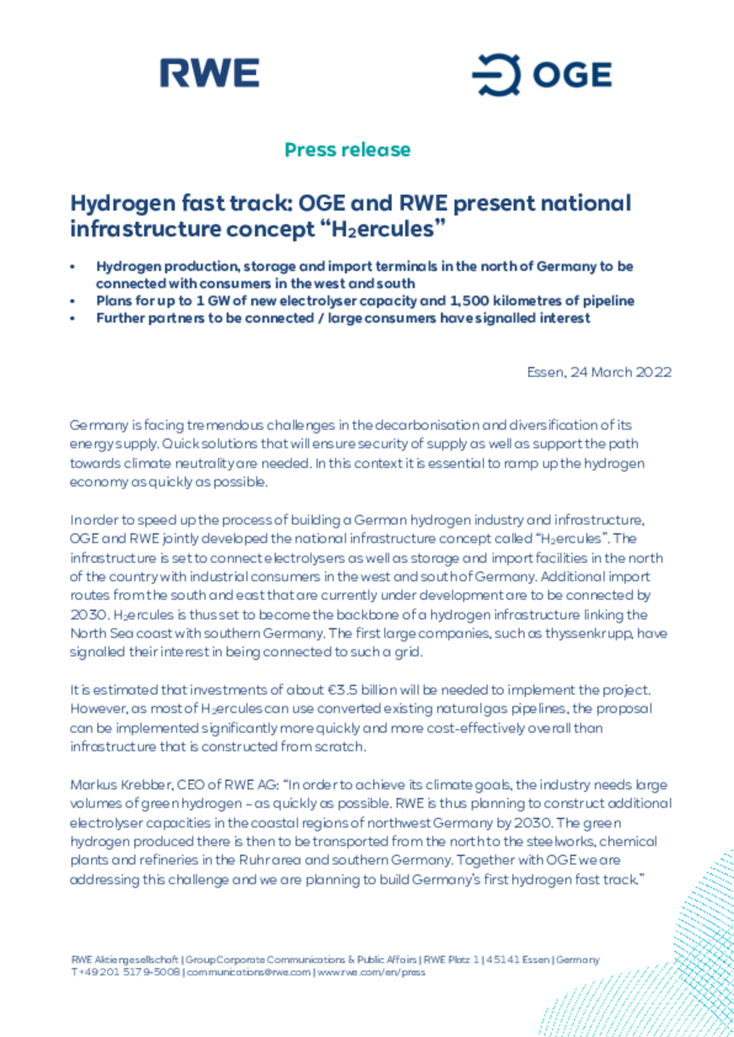Hydrogen fast track: OGE and RWE present national infrastructure concept “H₂ercules”