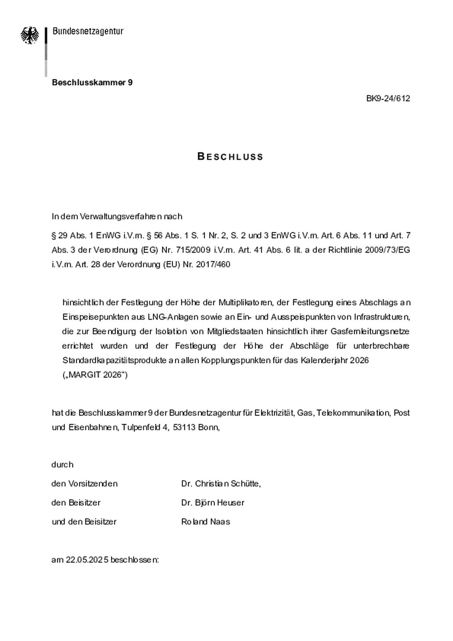 For the justification of the level of multipliers, OGE refers to the Federal Network Agency (German: Bundesnetzagentur [BNetzA]) Draft Decision BK9-24/612 (Decision ‘MARGIT 2026‘). MARGIT 2026 is currently only available in German language.