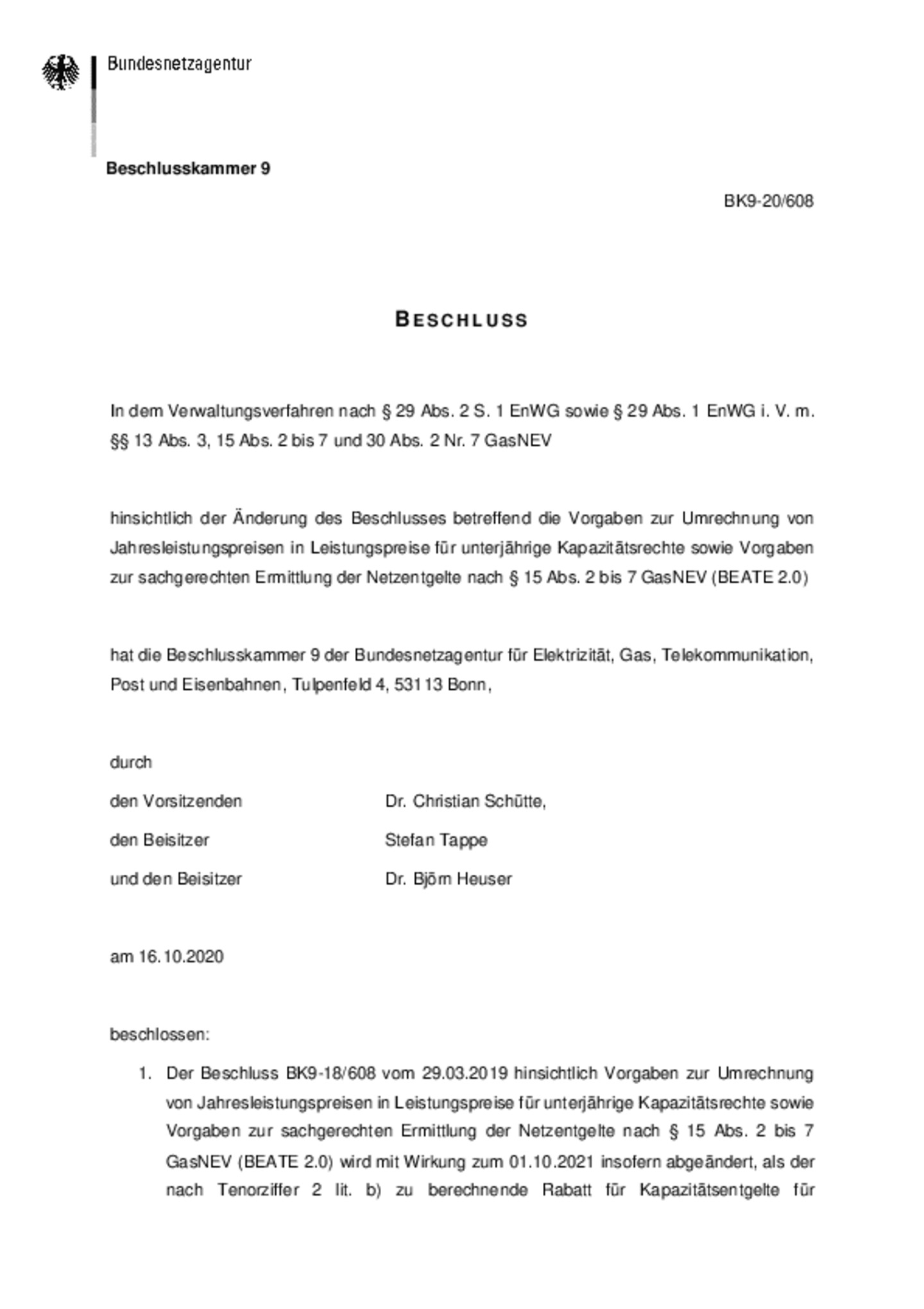 In conjunction with Art. 26 NC TAR consultation, the cost allocation test was carried out by the BNetzA. The test results, including an assessment, are published on the website of the Federal Network Agency via REGENT for the market area Trading Hub Europe (BK9-19/610) entry-exit system.