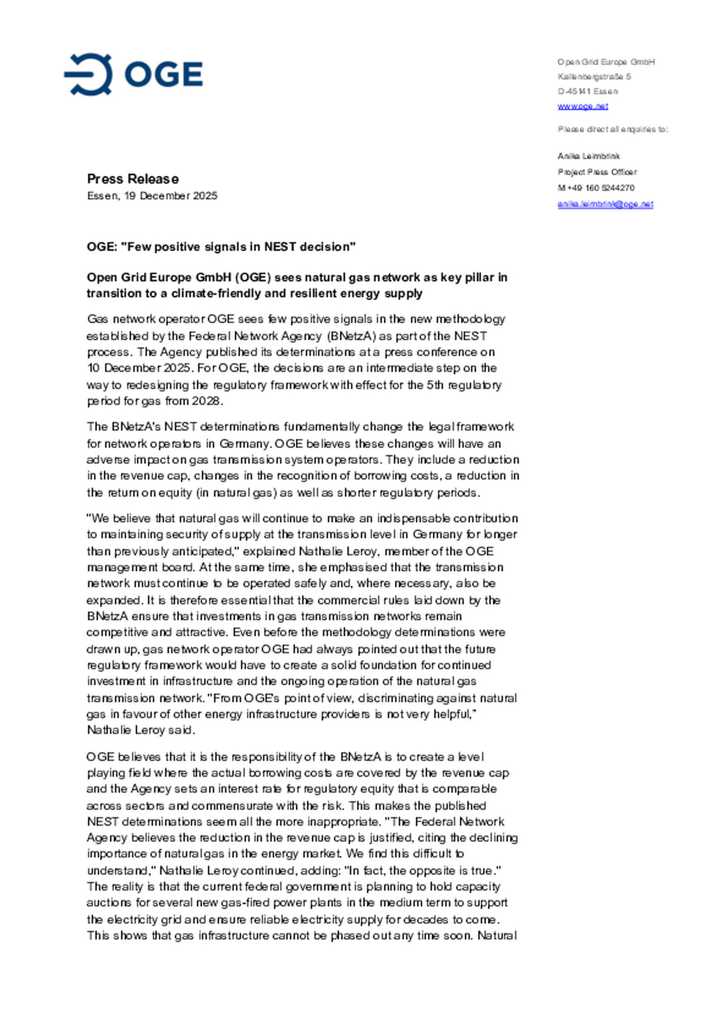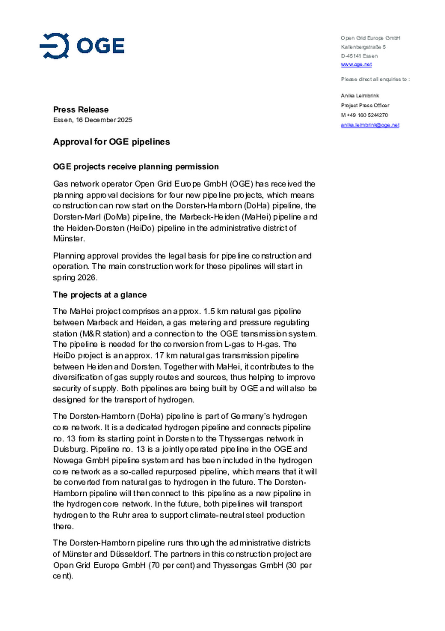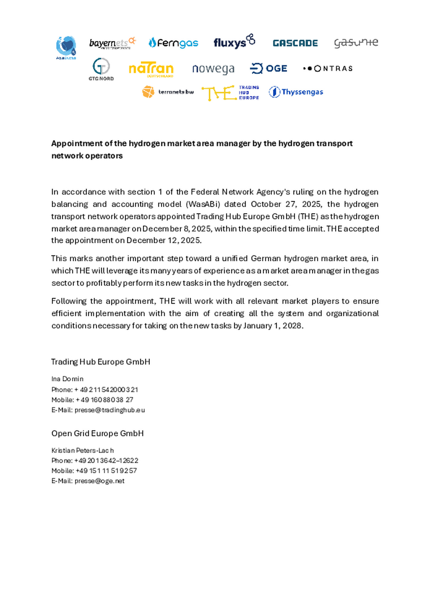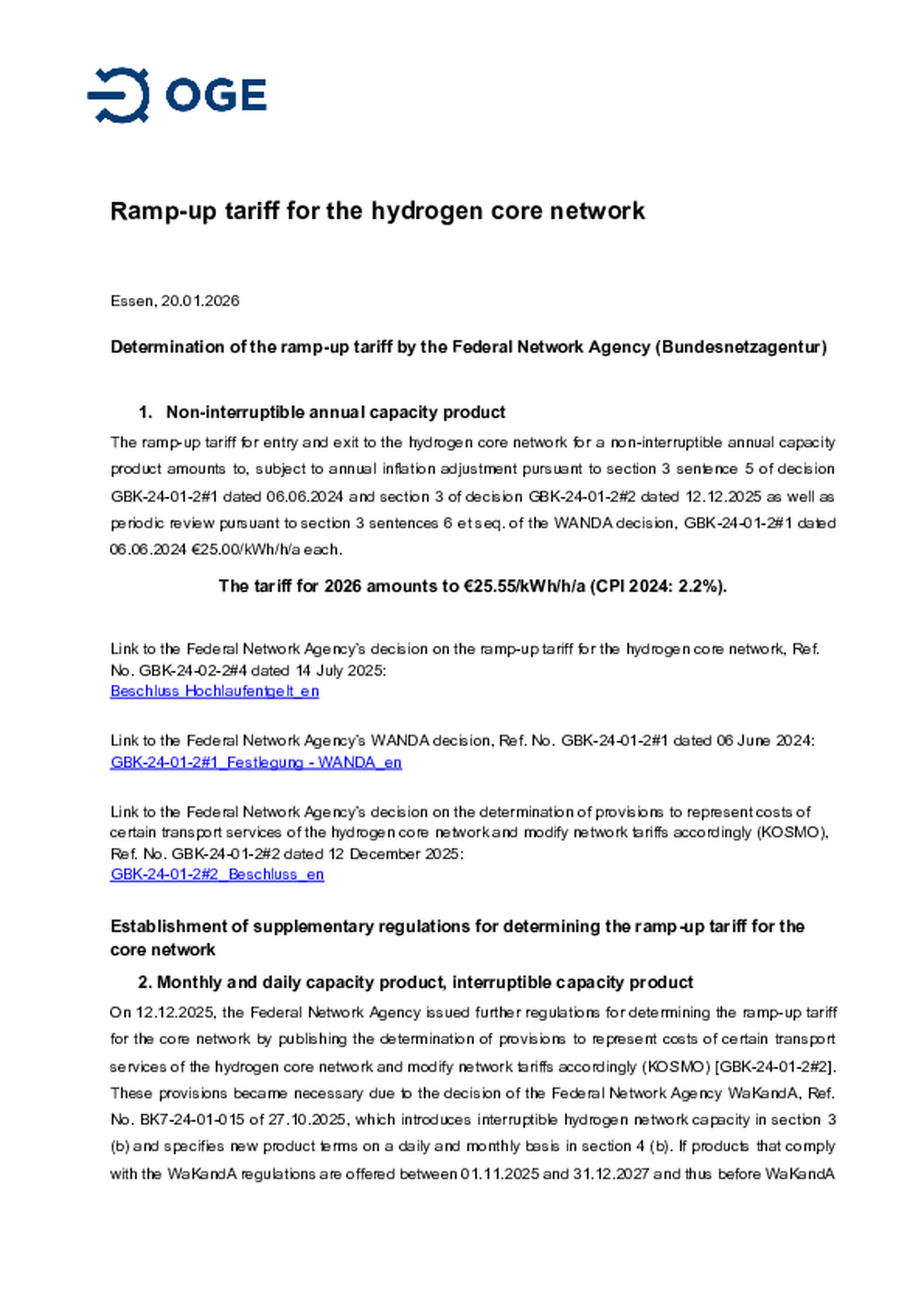 This price sheet is part of the General Terms and Conditions for Entry/Exit Contracts Governing the Transportation of Hydrogen in the GET H2 Network of Multiple Network Operators in the currently …valid version (GTC). Valid for hydrogen transports from commissioning of the first part of the GET H2 Network of Open Grid Europe GmbH (expected in Q1 2026). Status 20 January 2026