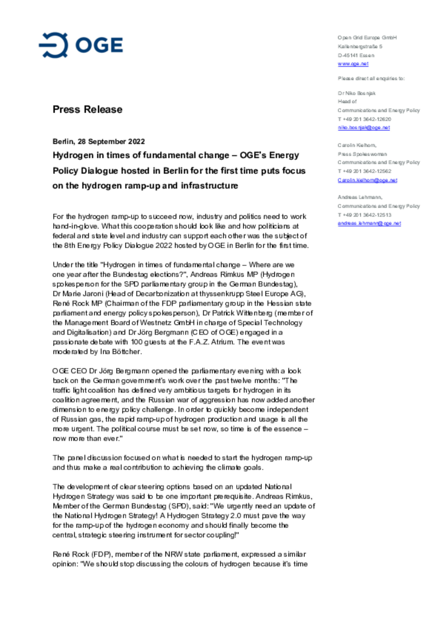 From left: Olaf Lies (Minister of Economics of Lower Saxony), Franz-Josef Kissing (Project Manager OGE), Thomas Hüwener (Member of the Management Board OGE), Morten Höegh (Shipping company Höegh), …Christian Lindner (Federal Minister of Finance), Siemtje Möller (Parliamentary State Secretary in the Federal Ministry of Defence), Niels Fenzl (Project Manager Uniper), Olaf Scholz (Federal Chancellor), Stephan Weil (Minister President of Lower Saxony), Holger Banik (Managing Director Niedersachsen Ports), Robert Habeck (Federal Minister of Economics), Christian Meyer (Minister of the Environment of Lower Saxony), Carsten Feist (Mayor of Wilhelmshaven)