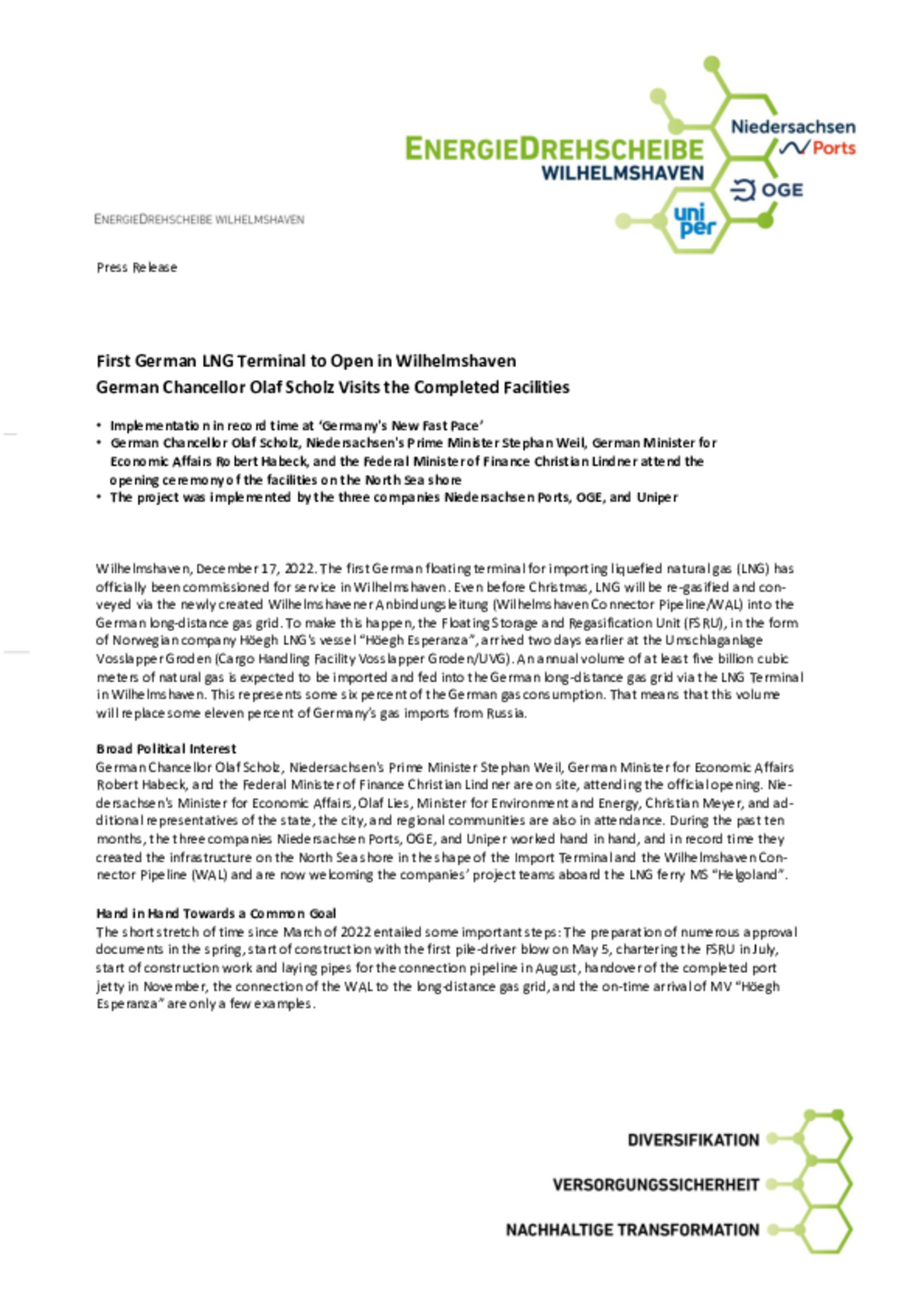 Press photo: First German LNG Terminal to Open in Wilhelmshaven. German Chancellor Olaf Scholz Visits the Completed Facilities.