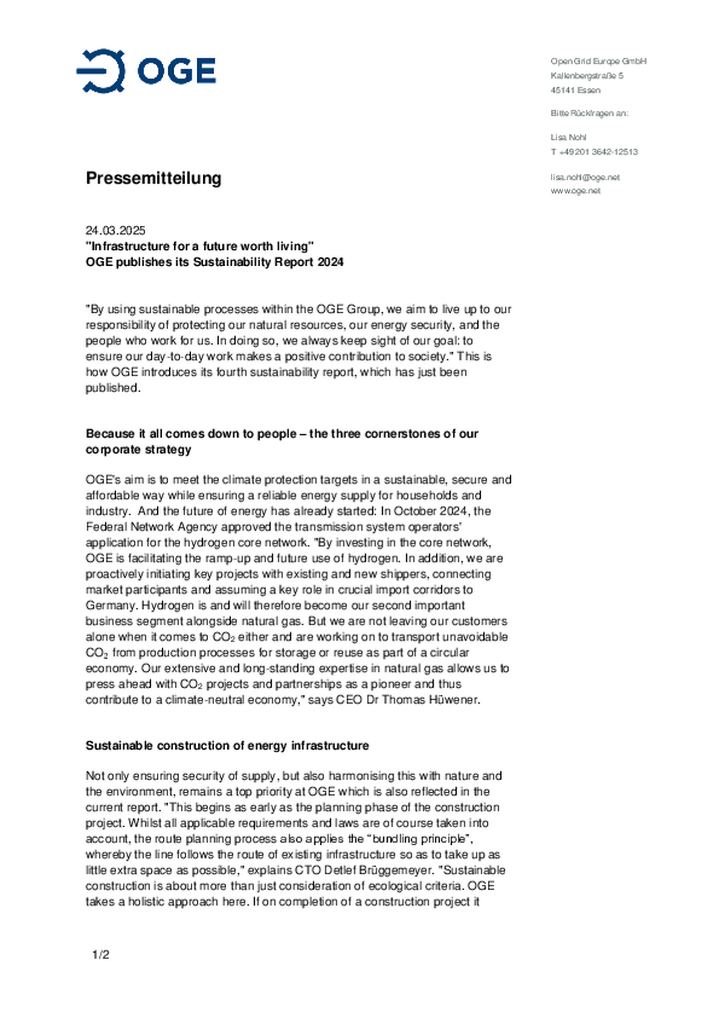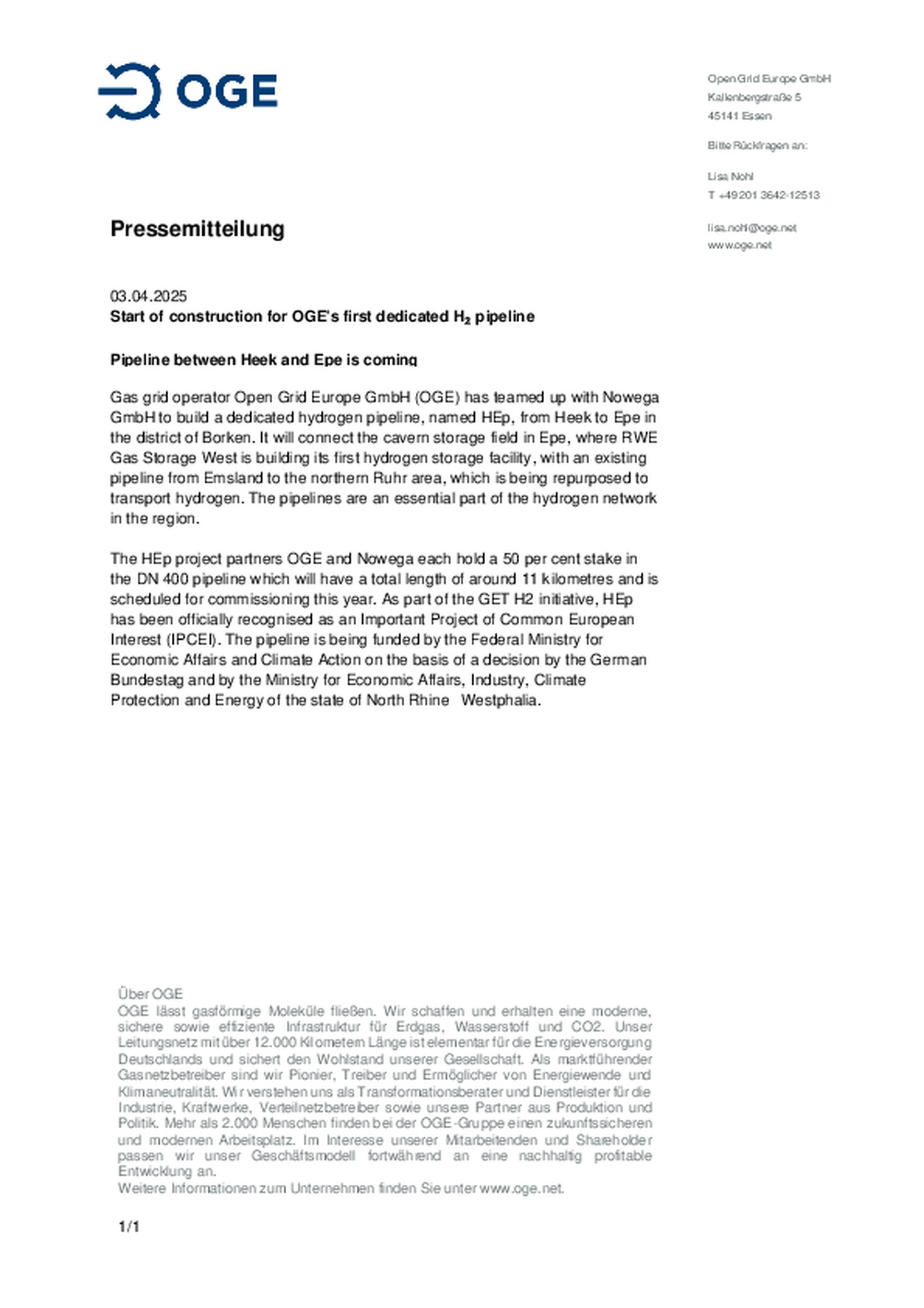 Gas grid operator Open Grid Europe GmbH (OGE) has teamed up with Nowega GmbH to build a dedicated hydrogen pipeline, named HEp, from Heek to Epe in the district of Borken.