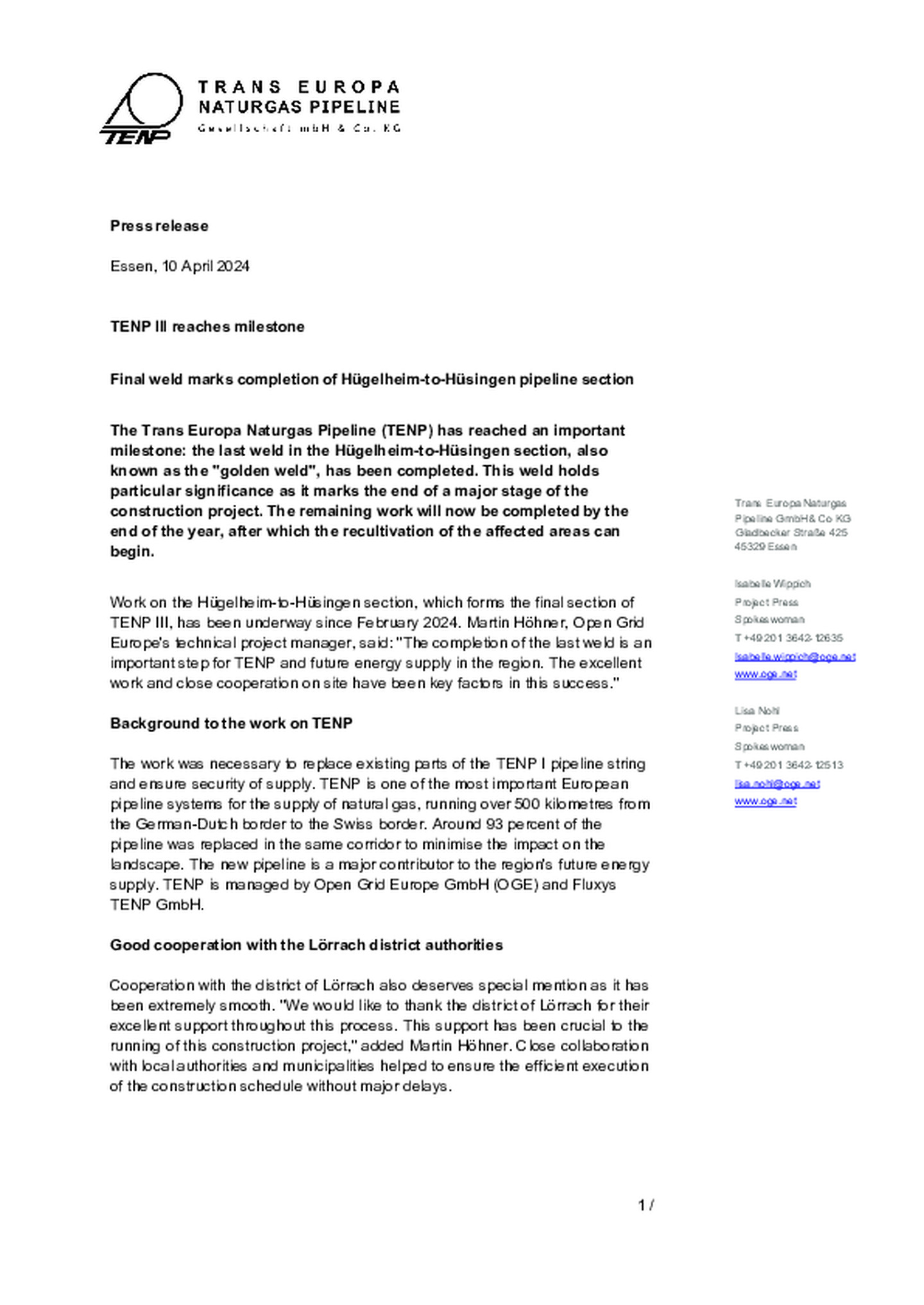 Final weld marks completion of Hügelheim-to-Hüsingen pipeline section