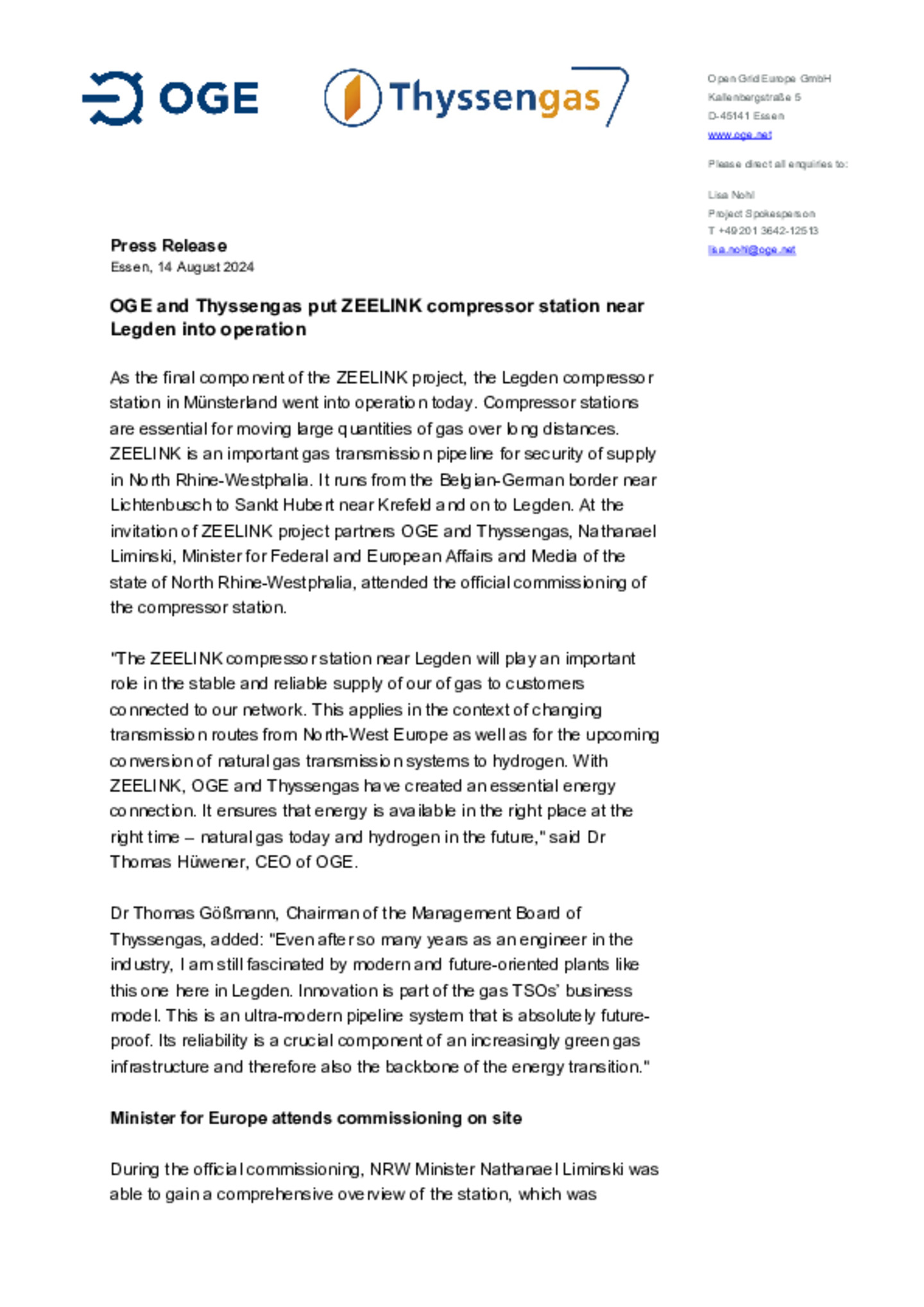OGE and Thyssengas put ZEELINK compressor station near Legden into operation