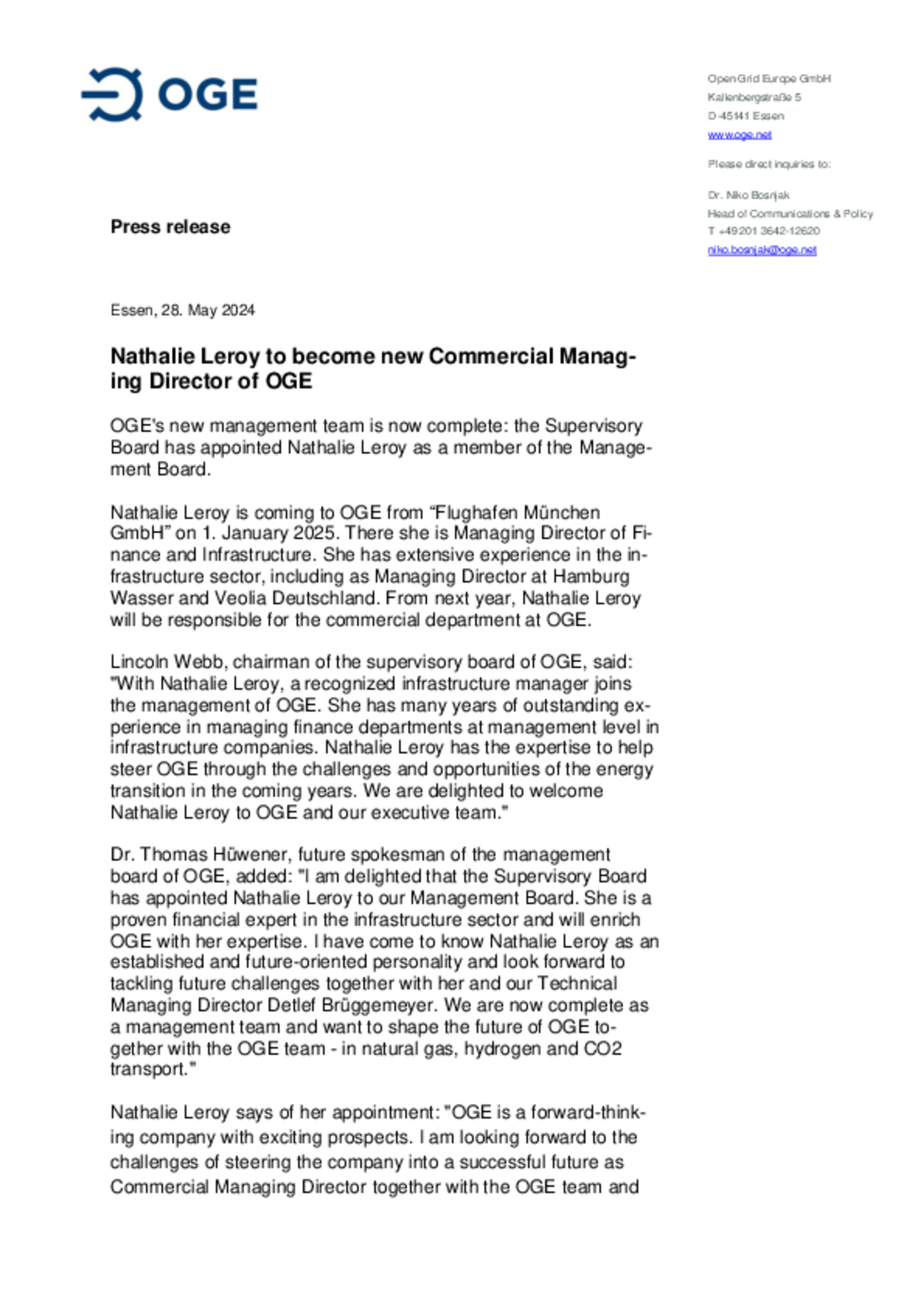 OGE's new management team is now complete: the Supervisory Board has appointed Nathalie Leroy as a member of the Management Board.