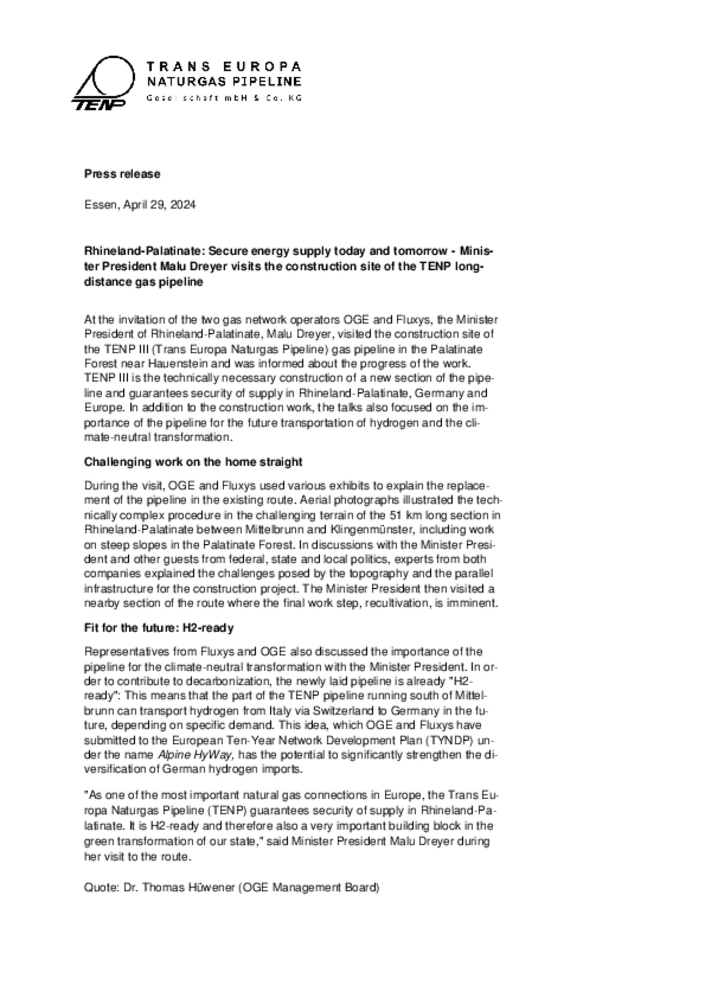 At the invitation of the two gas network operators OGE and Fluxys, the Minister President of Rhineland-Palatinate, Malu Dreyer, visited the construction site of the TENP III (Trans Europa Naturgas Pipeline) gas pipeline in the Palatinate Forest near Hauenstein and was informed about the progress of the work.