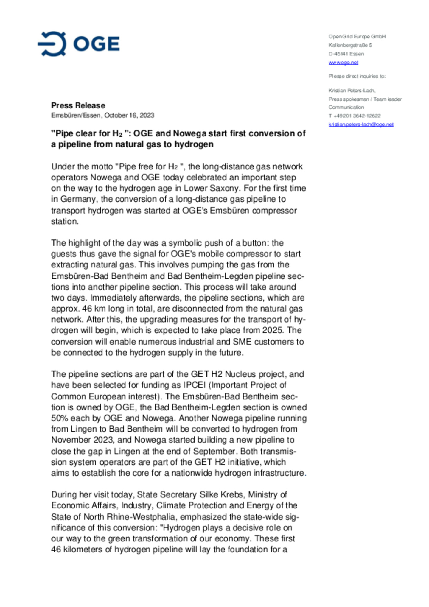 Under the motto "Pipe free for H2", the long-distance gas network operators Nowega and OGE today celebrated an important step on the way to the hydrogen age in Lower Saxony. For the first time in …Germany, the conversion of a long-distance gas pipeline to transport hydrogen was started at OGE's Emsbüren compres-sor station.